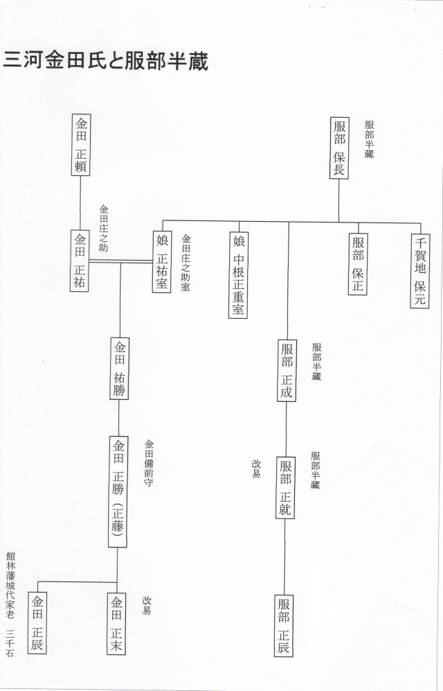 - 服部半蔵正成と金田祐勝は同年代で、子ども時代から祖父服部半蔵保長に兄弟のように育てられ、二人は駿府の竹千代に近侍として仕えた。